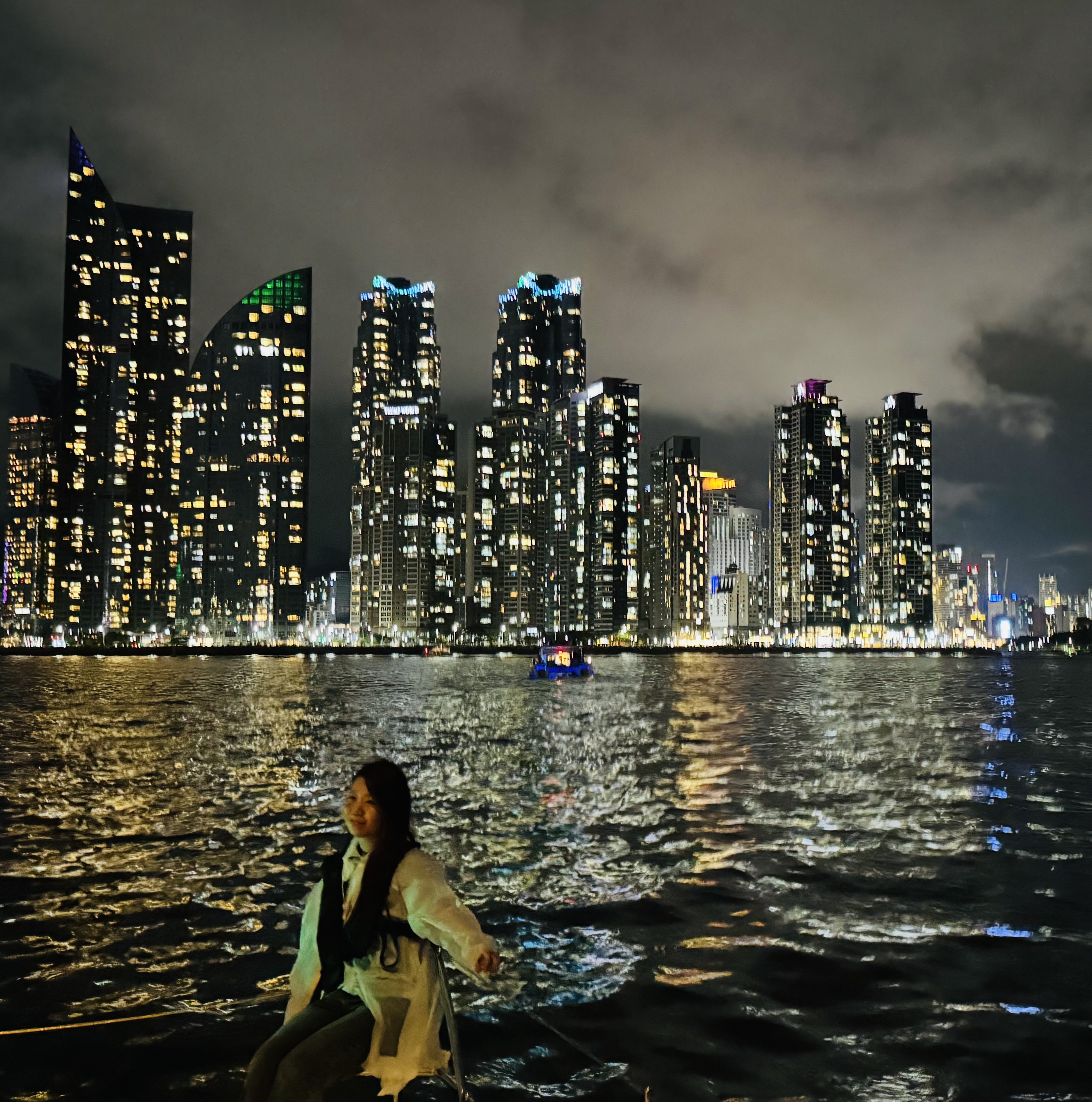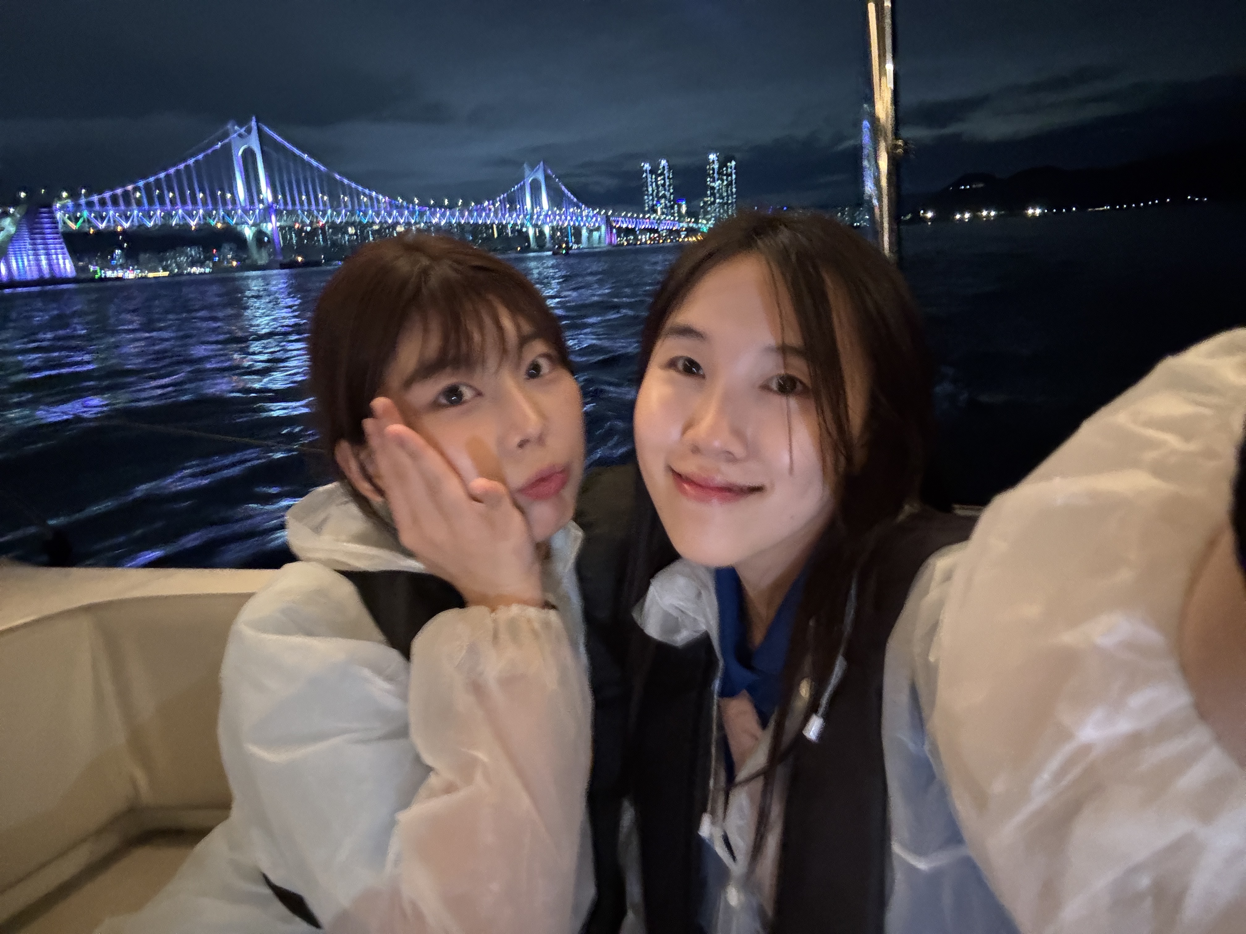 부산 밤바다를 천천히 가르며, 눈앞에 펼쳐진 광안대교의 화려한 조명과 하늘을 수놓은 불꽃을 감상했습니다.
