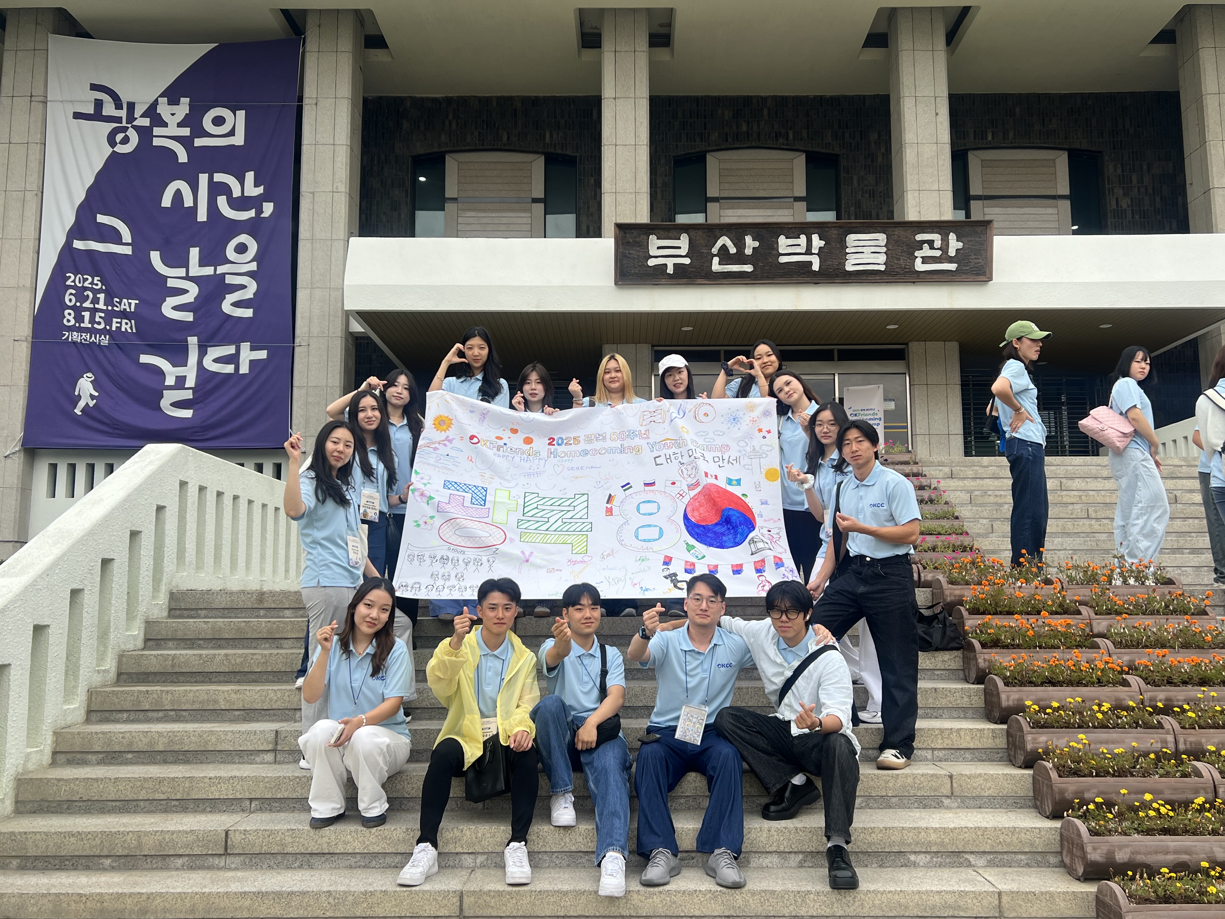 국립부산국악원에서 조별로 직접 만든 태극기를 높이 들고 광복 80주년을 기념하는 사진과 영상을 촬영했습니다.