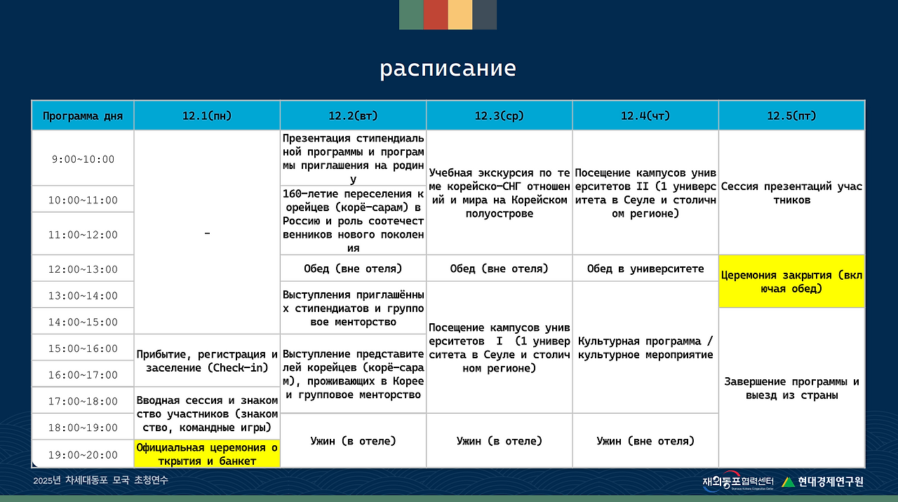 전체 프로그램 일정을 한국어와 러시아어로 정리했습니다.