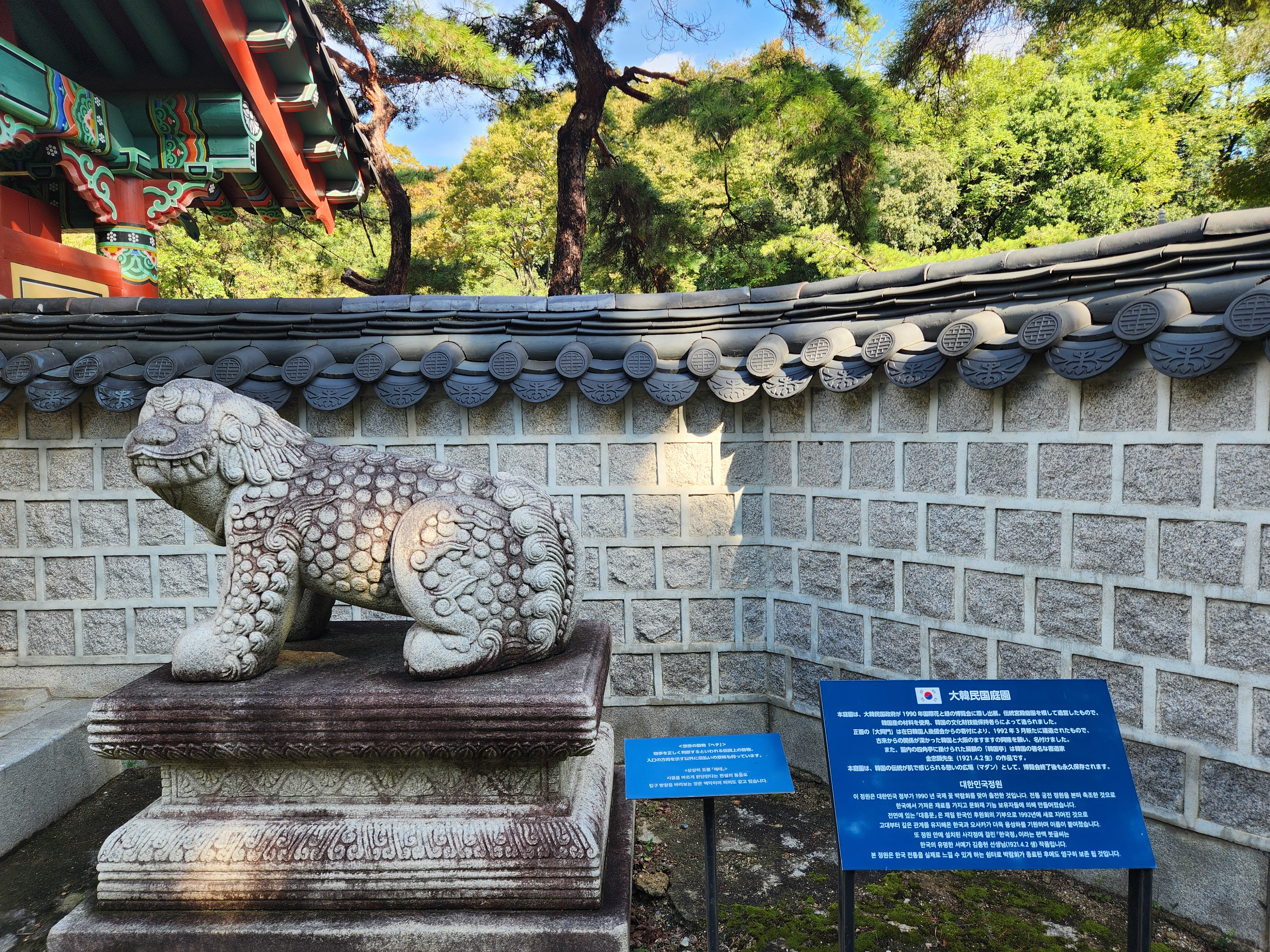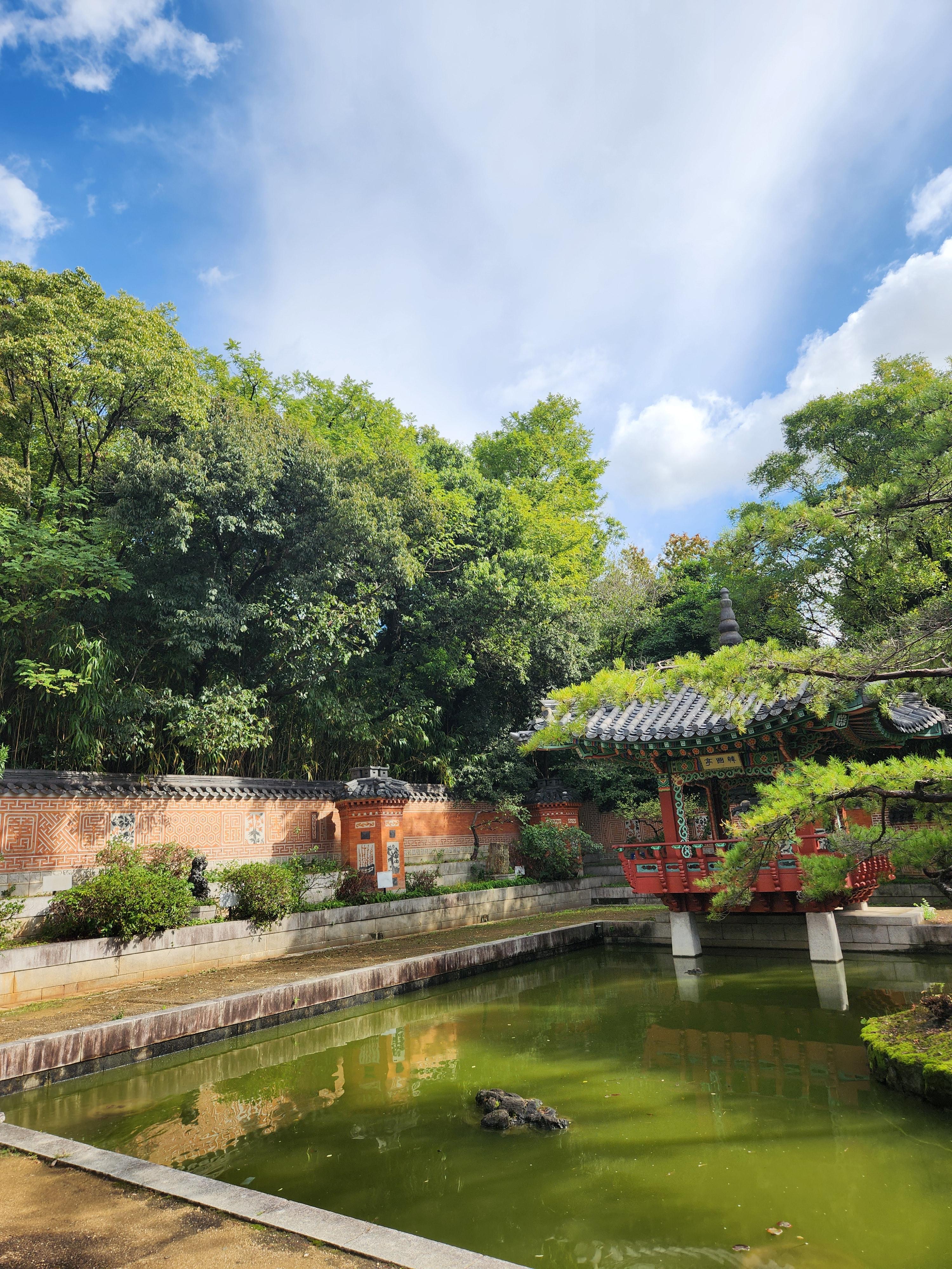 서울의 창덕궁, 경복궁을 모델로 만들어진 이 정원은 세월의 흔적이 고스란히 남아 있습니다. 기울어진 입구, 형태만 남은 안내판, 물이 고인 연못 등 관리가 필요한 부분들이 눈에 띄었습니다. 실제로 오사카에 거주하는 한국인과 일본인들 뿐 아니라 공원을 찾는 분들이 이곳이 한국 정원이라는 사실을 잘 모르고 현실이기도 합니다.