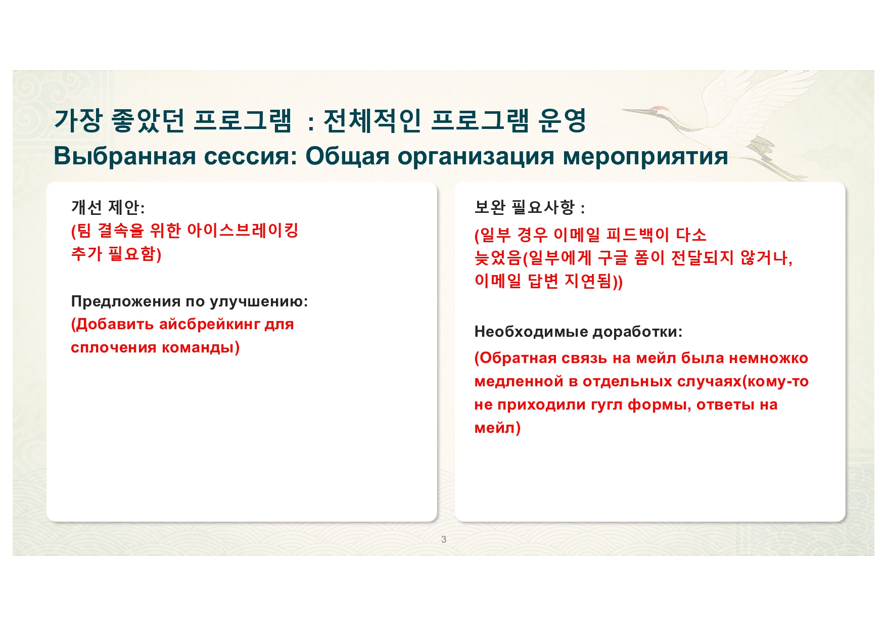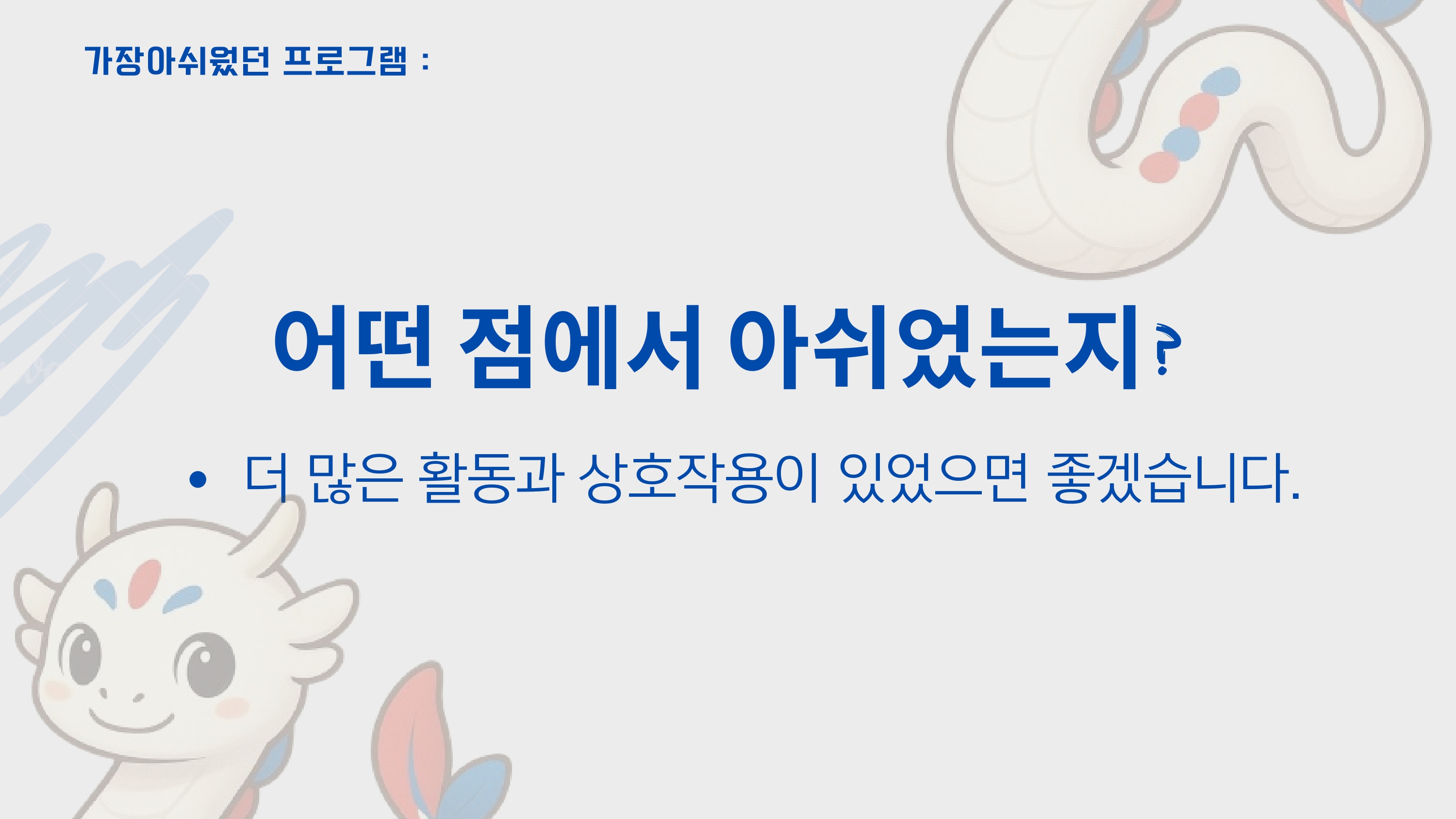 각 조는 프로그램에 만족했던 부분, 보완하면 좋은 부분에 대해 제안해주었고,