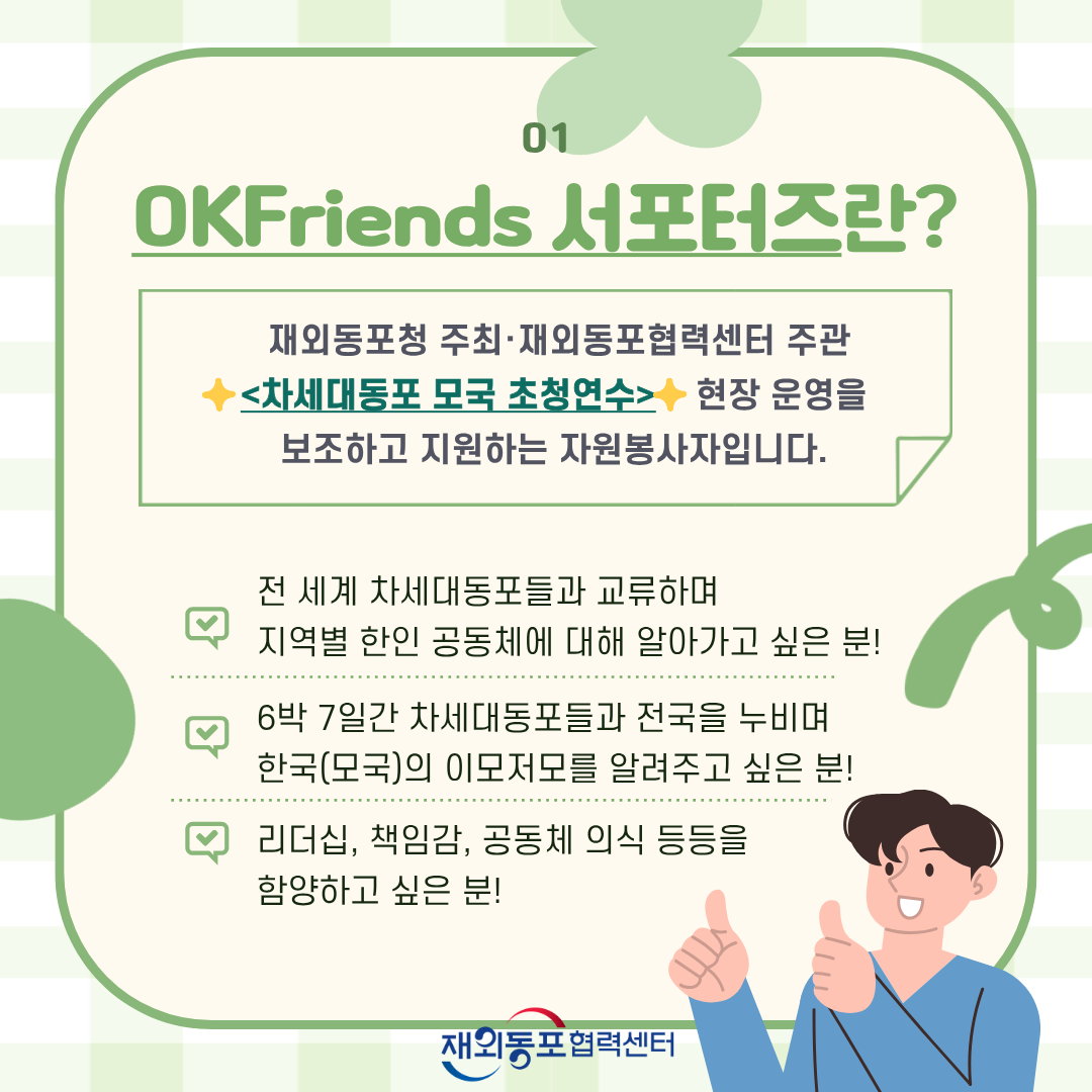 ㅇ 재외동포청 주최·재외동포협력센터 주관 <차세대동포 모국 초청연수>- (공식 블로그 참고: https://okfcamp.tistory.com/) 현장 운영을 보조하고 지원하는 자원봉사자 입니다.