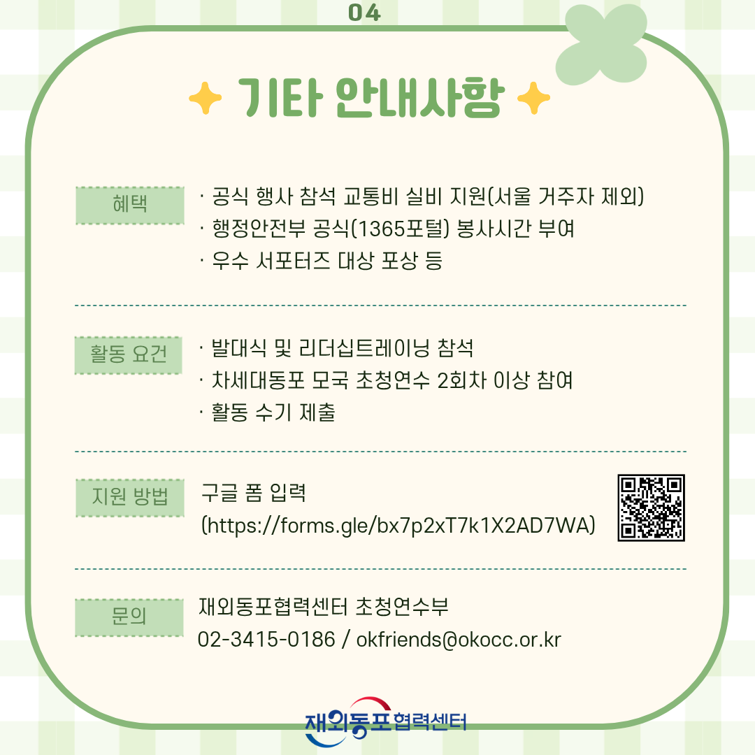 5. 문의처: [재외동포협력센터 초청연수부] 02-3415-0186 / okfriends@okocc.or.kr